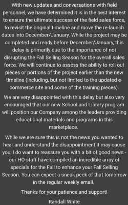 LOOK!! Randall speaks to us again! Gosh Randall, thanks for not being 100% honest with your ‘sales force’ and investors as to WHY you had to put the division on hold!