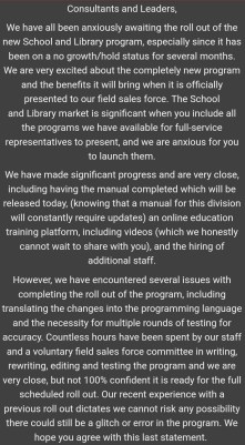 Now, almost 18 months later, UBAM made an announcement about relaunching their new and improved, spit shined School and Library division of the company that was suppose to launch September 12th. It should be noted the School and Library division of the company is NOT part of the retail division of the company; it is, however, part of the home-based business side, the MLM side. So as one commenter mentioned, you basically are having a Tupperware party at a school with a really pushy representative who have no marketing skills what so ever.